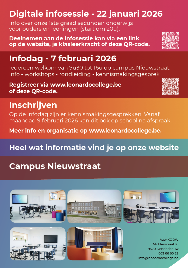 Je hebt al een mooi parcours afgelegd in de lagere school en vanaf nu ga je nog gerichter verder bouwen aan je toekomst. Je wil dat doen in het Leonardo College. Schitterend! Dat is een nieuwe uitdaging die je met de nodige ambitie en nieuwsgierigheid zal aanvatten. Tijdens de Doedag heb je misschien al kennisgemaakt met onze campus Nieuwstraat. Om goed geïnformeerd aan de start te komen bieden we jou dit programma aan: