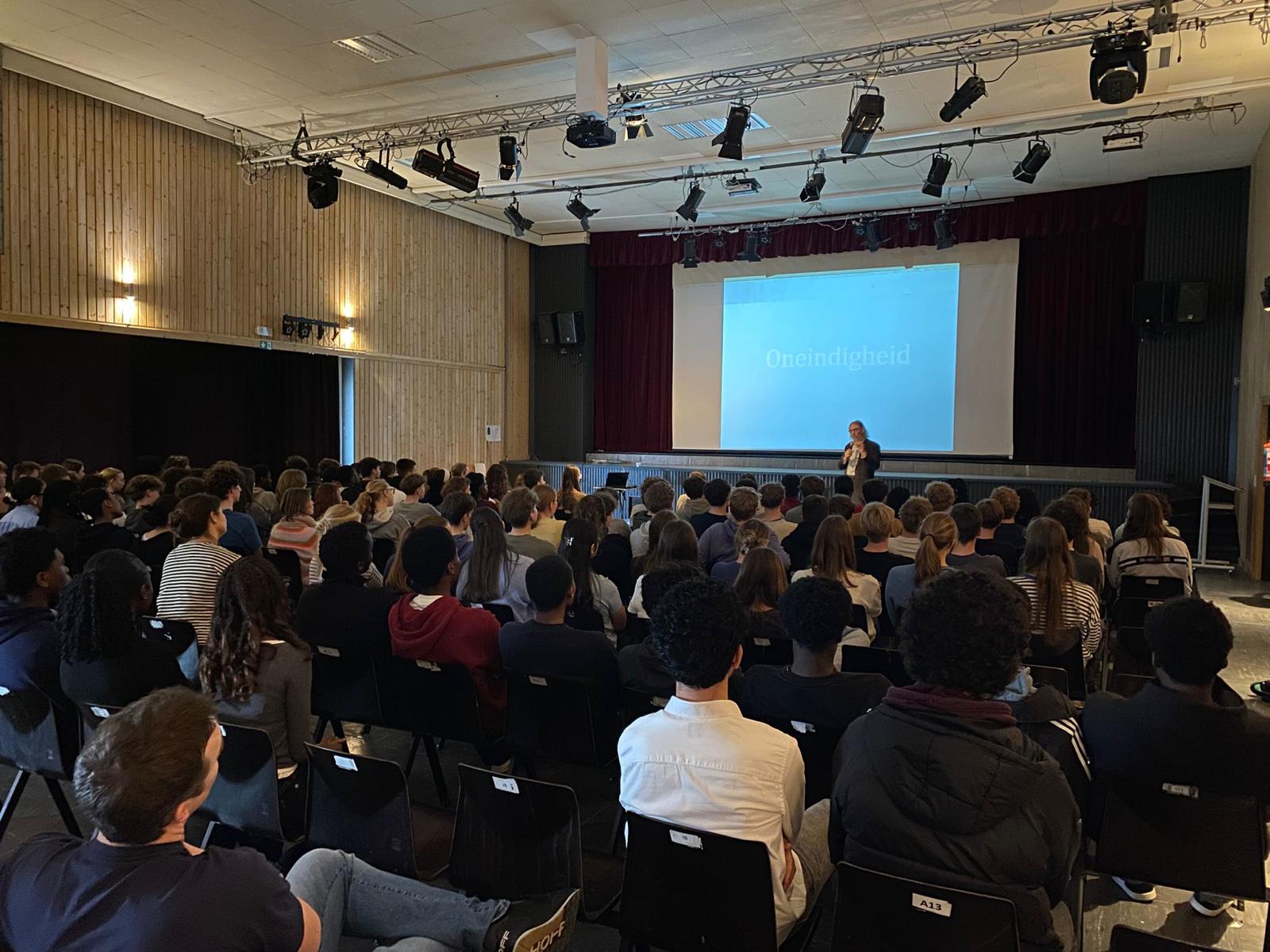 Op 3 maart kwam dan professor Jean Paul Van Bendegem, licentiaat wiskunde en doctor in de wijsbegeerte, naar jaarlijkse traditie langs voor een lezing over wiskunde, filosofie en nog zoveel meer. Onze wiskundeknobbels van het 5de en 6de jaar genoten van de bevlogen spreker.